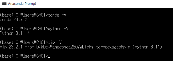 가상환경을 제공하는 아나콘다(Anaconda)에서 필수적인 명령어를 정리하고자 합니다. 1) 버전 확인 [Anaconda Prompt(anaconda3)] (base) D:\NextTime\cwwDev>conda -V conda 4.13.0 2) 라이브러리(패키지) 설치, 업데이트